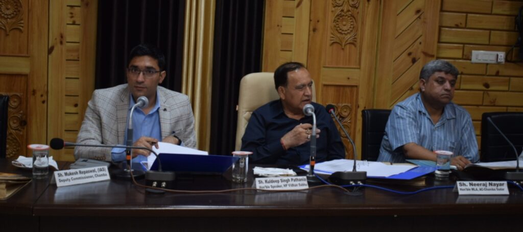 जिला मुख्यालय चंबा में सोमवार को जिला स्तरीय परामर्शदात्री समिति की त्रैमासिक समीक्षा बैठक का आयोजन किया गया, जिसकी अध्यक्षता विधानसभा अध्यक्ष कुलदीप सिंह पठानिया ने की। बैठक में वित्तीय वर्ष 2024-25 की अंतिम तिमाही की प्रगति की समीक्षा की गई। बैठक की शुरुआत में उपायुक्त एवं समिति अध्यक्ष मुकेश रेपसवाल द्वारा विधानसभा अध्यक्ष का स्वागत कर सम्मानित किया गया।