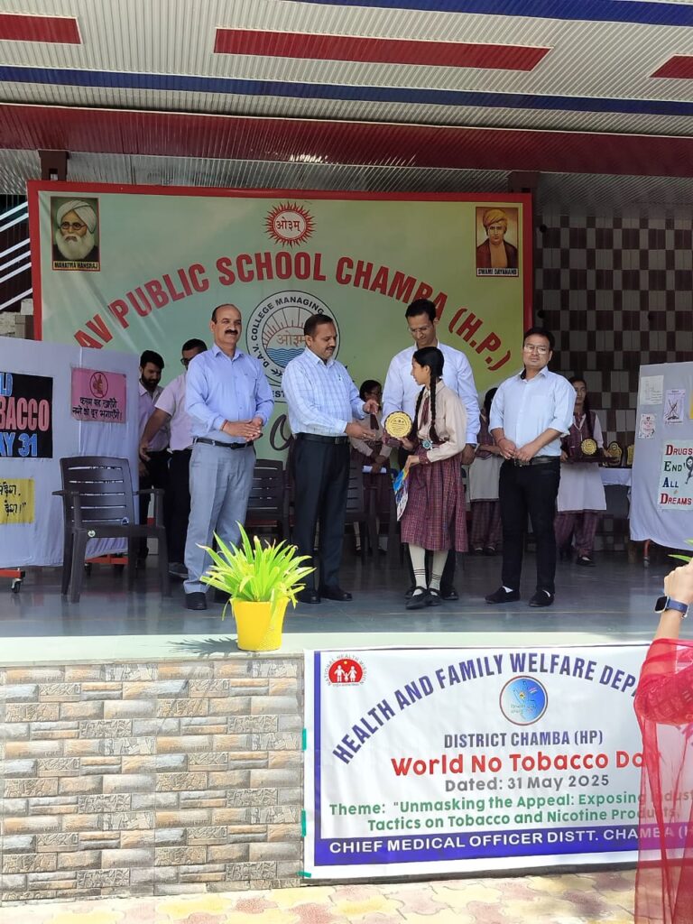 स्वास्थ्य एवं परिवार कल्याण विभाग चंबा द्वारा विश्व तंबाकू निषेध दिवस के उपलक्ष्य में डीएवी सीनियर सेकेंडरी स्कूल हरदासपुरा में जागरूकता शिविर का आयोजन किया गया। कार्यक्रम की अध्यक्षता जिला कार्यक्रम अधिकारी डॉ. करण हितैषी ने की, जबकि स्कूल प्राचार्य श्री अशोक गुलेरिया भी विशेष रूप से उपस्थित रहे।इस अवसर पर डॉ. हितैषी ने छात्रों को तंबाकू के दुष्प्रभावों से अवगत कराते हुए बताया कि यह केवल व्यक्तिगत स्वास्थ्य ही नहीं बल्कि समाज और पर्यावरण के लिए भी घातक है।