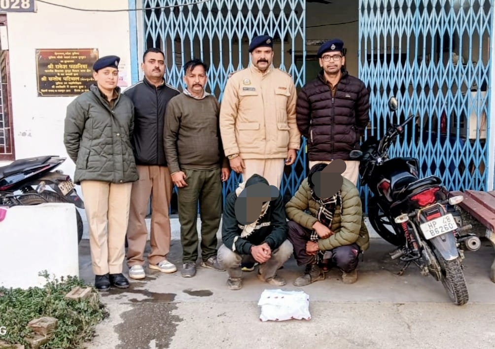 मोटरसाइकिल पर सवार दोनों युवक पुलिस को देखकर घबरा गए और भागने का प्रयास करने लगे। हालांकि, मौके पर तैनात सतर्क पुलिस कर्मियों ने तत्परता दिखाते हुए दोनों को तुरंत काबू कर लिया।पुलिस द्वारा की गई गहन तलाशी के दौरान मोटरसाइकिल पर सवार एक युवक के पिट्ठू बैग से 717 ग्राम चरस/कैनाबिस बरामद की गई। इसके बाद पुलिस ने नियमानुसार बरामद मादक पदार्थ और मोटरसाइकिल को अपने कब्जे में ले लिया।गिरफ्तार किए गए आरोपियों की पहचान 20 वर्षीय लाल हुसैन पुत्र नेक मोहम्मद निवासी गांव मलेठी, डाकघर सिलाघराट, जिला चम्बा, तथा 25 वर्षीय मोहम्मद शरीफ पुत्र मूसा निवासी गांव भलू, डाकघर सिलाघराट, जिला चम्बा, उ के रूप में हुई है।