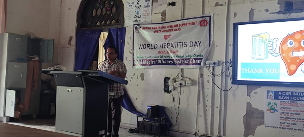 पंडित जवाहरलाल नेहरू राजकीय मेडिकल कॉलेज चंबा में जिला स्तरीय विश्व हेपेटाइटिस दिवस का आयोजन किया गया। इस अवसर पर मुख्य चिकित्सा अधिकारी डॉ. विपिन ठाकुर ने कार्यक्रम की अध्यक्षता करते हुए लोगों को हेपेटाइटिस के बारे में जागरूक किया। उन्होंने बताया कि हर वर्ष 28 जुलाई को यह दिवस मनाया जाता है ताकि इस रोग से जुड़ी जानकारी जनसामान्य तक पहुंचे।उन्होंने बताया कि हेपेटाइटिस एक गंभीर लिवर रोग है, जो वायरल संक्रमण, दूषित भोजन-पानी, संक्रमित रक्त व असुरक्षित यौन संबंधों के माध्यम से फैल सकता है।