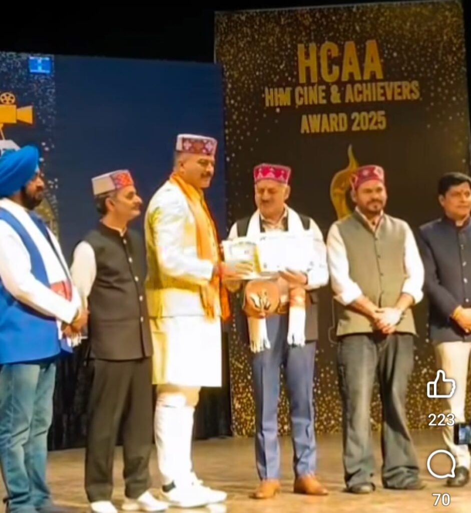 शिमला के ऐतिहासिक गेयटी थिएटर में आयोजित हिम सिने एंड अचीवर्स अवॉर्ड्स-2025 में हिमाचल प्रदेश के प्रसिद्ध लोक गायक और सामाजिक कार्यकर्ता प्रेम शर्मा को सम्मानित किया गया। हिमाचल प्रदेश पुलिस को “बेस्ट हिमाचली गायक और सामाजिक कार्यकर्ता (नशे के खिलाफ अभियान)” अवॉर्ड से नवाजते हुए तकनीकी शिक्षा, व्यावसायिक और औद्योगिक प्रशिक्षण मंत्री राजेश धर्माणी ने उन्हें मंच पर सम्मानित किया। इस अवसर पर मंत्री ने प्रेम शर्मा के लोक गायन, नशे के खिलाफ अभियान में सक्रिय भूमिका और संस्कृति को संजोए रखने में दिए गए योगदान की सराहना की और उज्ज्वल भविष्य की शुभकामनाएं भी दीं।