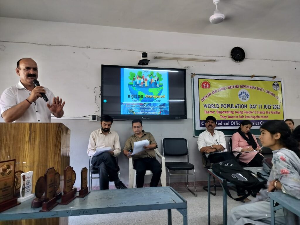 जिला स्वास्थ्य विभाग चंबा द्वारा आज मुख्य चिकित्सा अधिकारी डॉ. विपन ठाकुर के दिशा-निर्देशानुसार डिग्री कॉलेज चंबा में जिला स्तरीय विश्व जनसंख्या दिवस का आयोजन किया गया। इस अवसर पर छात्रों के लिए जागरूकता शिविर के साथ-साथ भाषण प्रतियोगिता और पोस्टर मेकिंग प्रतियोगिता का आयोजन भी किया गया।कार्यक्रम में जन शिक्षा एवं संप्रेषण अधिकारी छांगा राम ठाकुर ने छात्रों को संबोधित करते हुए विश्व में तेजी से बढ़ती जनसंख्या को गंभीर चिंता का विषय बताया। उन्होंने बताया कि बढ़ती जनसंख्या के कारण गरीबी, बेरोजगारी, अशिक्षा, लैंगिक हिंसा, मानवाधिकारों का उल्लंघन और जनसंख्या पलायन जैसी समस्याएं जन्म ले रही हैं, जिनसे न केवल भारत, बल्कि पूरा विश्व जूझ रहा है।उन्होंने छोटे परिवार के महत्व को रेखांकित करते हुए स्थाई और अस्थाई परिवार नियोजन उपायों जैसे कि निरोध, माला एन, माला डी, छाया गोलियां, कॉपर-टी, अंतरा इंजेक्शन, पुरुष नसबंदी और महिला नसबंदी अपनाने पर बल दिया।
