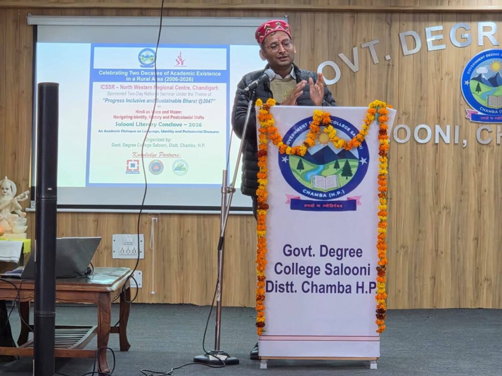 आईसीएसएसआर-एनडब्ल्यूआरसी प्रायोजित दो दिवसीय राष्ट्रीय संगोष्ठी “Hindi as Voice and Vision: Navigating Identity, History, and Postcolonial Shifts” के अंतर्गत “सलूणी साहित्य सम्मेलन–2026” का आज भव्य शुभारंभ हुआ। यह आयोजन महाविद्यालय के ग्रामीण क्षेत्र में 20 वर्ष पूर्ण होने के उपलक्ष्य में आयोजित किया जा रहा है, जो संस्थान की शैक्षणिक यात्रा का एक महत्वपूर्ण पड़ाव माना जा रहा है। सम्मेलन का प्रथम दिवस उत्साह और शैक्षणिक ऊर्जा के साथ सफलतापूर्वक संपन्न हुआ।कार्यक्रम की शुरुआत पारंपरिक दीप प्रज्वलन और सरस्वती वंदना के साथ हुई। उद्घाटन सत्र में सेवानिवृत्त प्राचार्य डॉ. शिव दयाल मुख्य अतिथि के रूप में उपस्थित रहे, जबकि मुख्य वक्ता डॉ. बृजेंद्र कुमार अग्निहोत्री ने हिंदी भाषा की समकालीन भूमिका पर अपने विचार साझा किए।